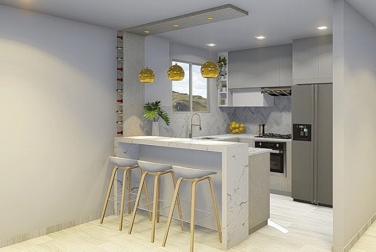 This minimalist kitchen is designed to maximize space and natural light. Featuring a light color palette, it includes handleless cabinets for clean, efficient storage. The functional countertop with an integrated sink below a large window adds practicality, while wood accents and natural accessories like baskets and plants provide a warm touch.